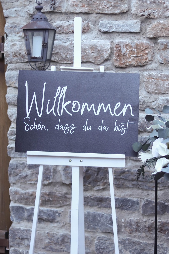 Unser handgemachtes Willkommensschild in Schwarz kommt auf jeder Feier gut an. Ein Begrüßungsschild ist ein echtes Must have auf Eurem Event.